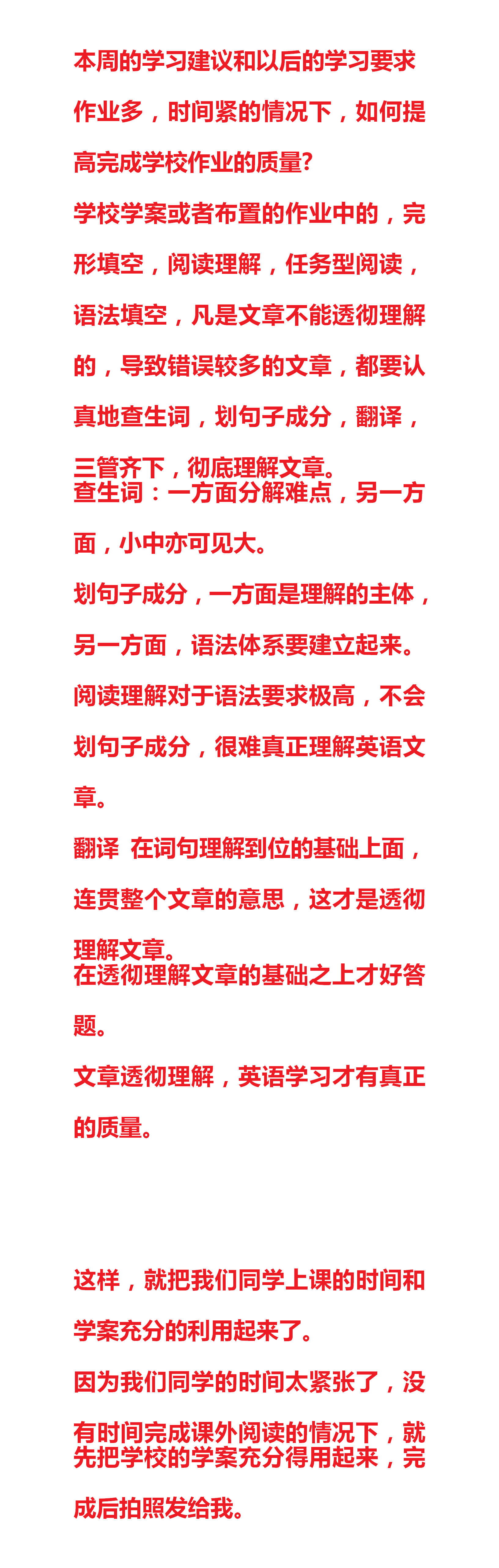 3,其余六天每天在家半小时听写新概念、半小时阅读原著英文书、杂志、报纸或学校阅读作业 五句长难句句子成分划分。平时试卷有错题的阅读理解和完形填空的文章,全文分析长难句句子成分后翻译成中文,透彻理解文章。